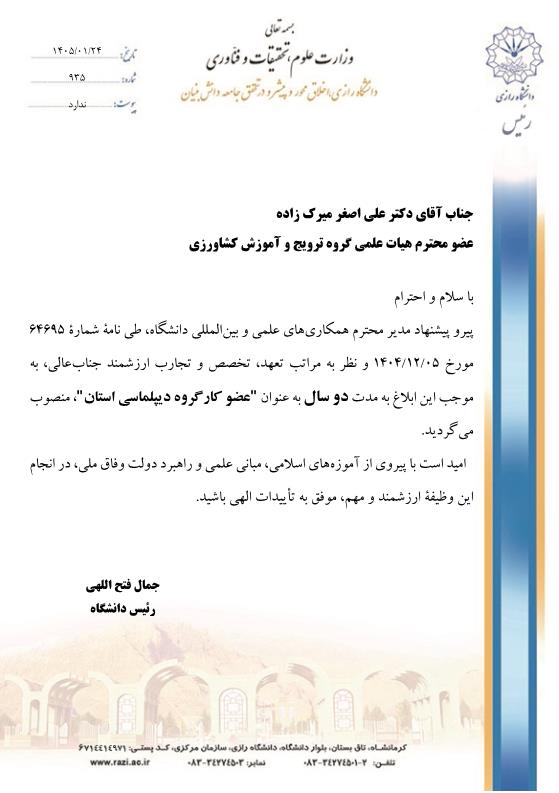انتصاب دکتر علی اصغر میرک زاده در کارگروه دیپلماسی استان کرمانشاه - دانشکده کشاورزی