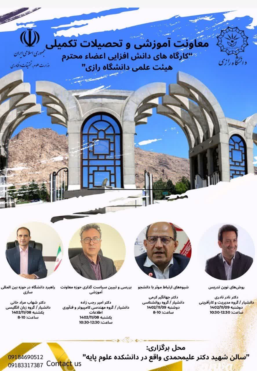 6376 معاونت آموزشی و تحصیلات تکمیلی دانشگاه رازی برگزار میکند: کارگاههای دانش افزایی اعضای محترم هیئت علمی 🗓 یکشنبه ۸ و دوشنبه ۹ بهمن ۱۴۰۲ ⏰ ساعت ۸:۰۰ الی ۱۲:۳۰ 📍سالن شهید علیمحمدی، دانشکده علوم...